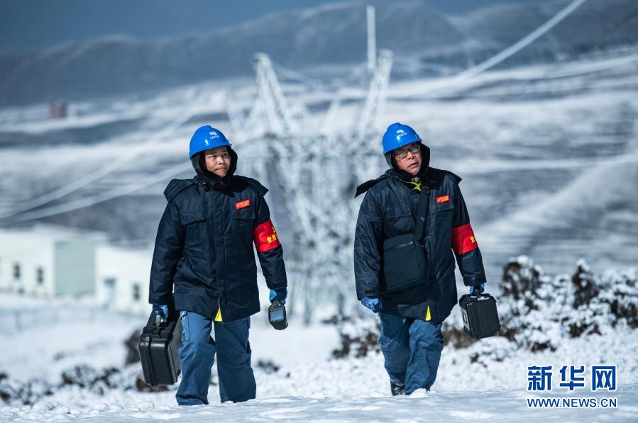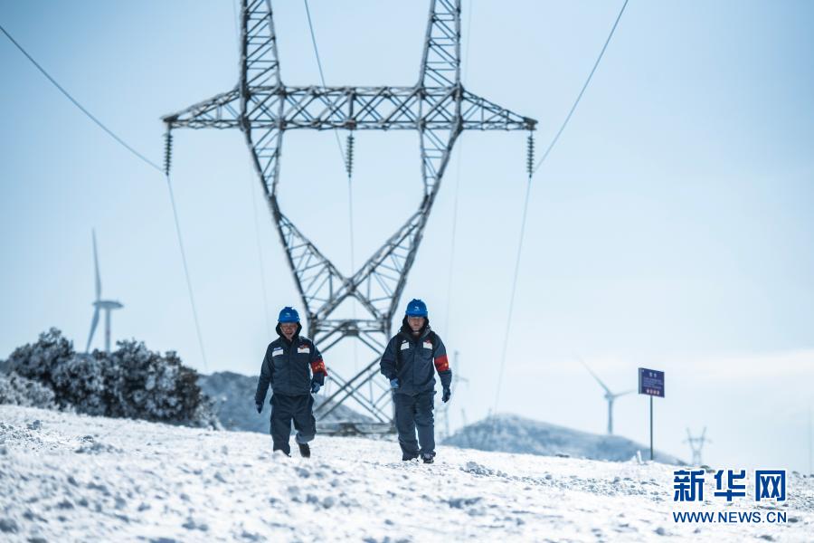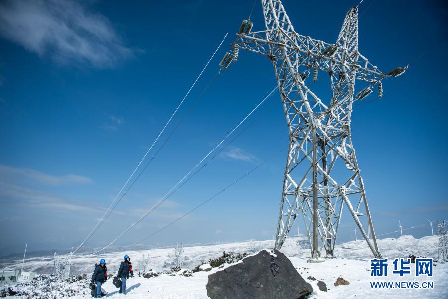 六盘水供电局输电所巡检2班工作人员在对110KV四柏线开展特巡特维工作(1月12日摄)。 近日,贵州省六盘水市连续出现降雪天气。南方电网贵州六盘水供电局迅速启动应急预案,组织人员对输变配电设备开展特巡特维工作,排查线路杆塔积雪、覆冰、树障等情况,保障辖区内电网安全稳定运行。 新华社记者 陶亮 摄