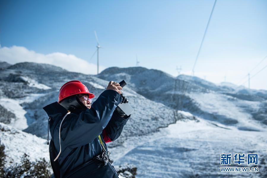 六盘水供电局输电所巡检2班工作人员在四格风电场使用覆冰观测仪检查线路覆冰情况(1月12日摄)。 新华社记者 陶亮 摄