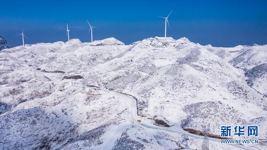 六盘水供电局输电所巡检2班工作人员在四格风电场开展特巡特维工作(1月12日摄,无人机照片)。 新华社记者 陶亮 摄