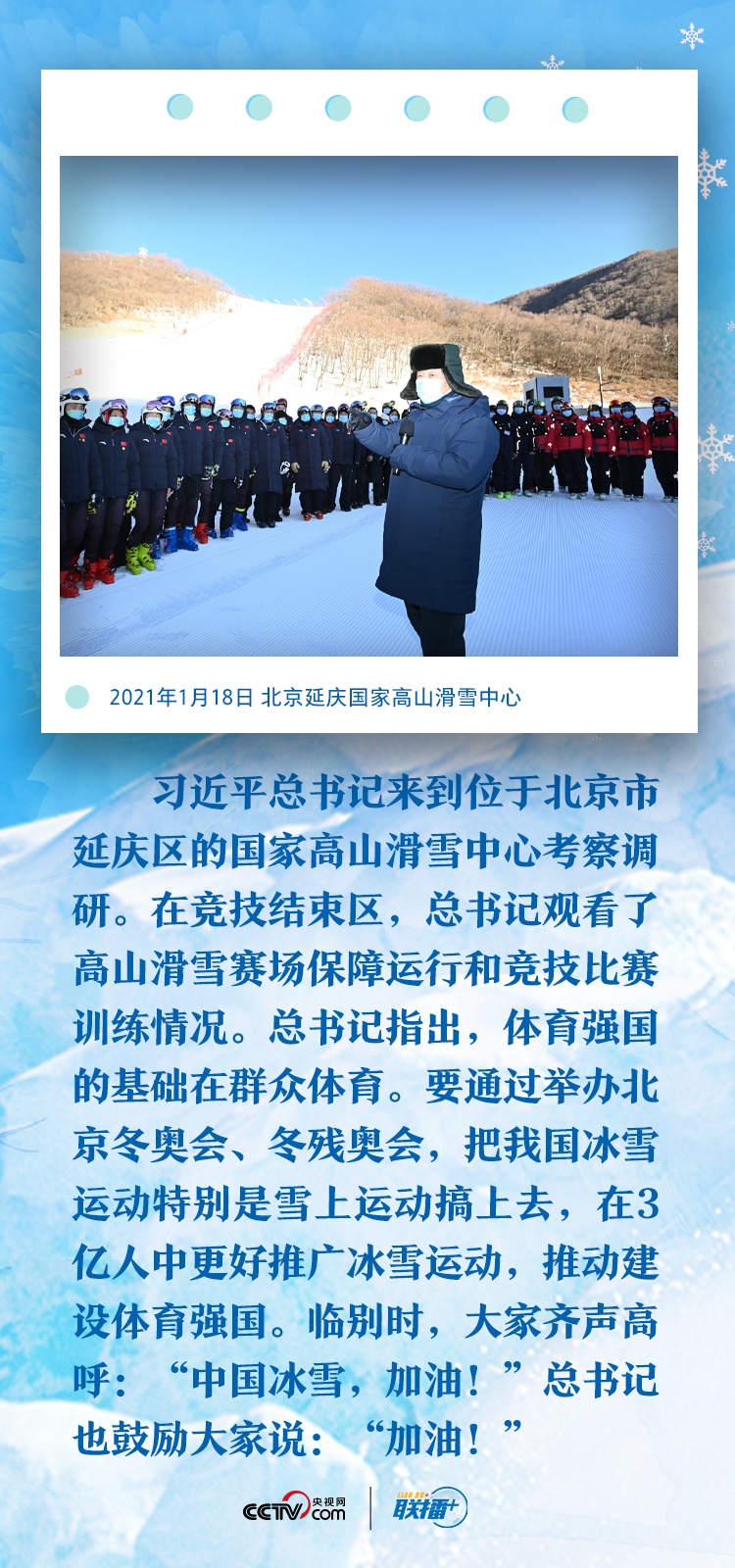 1月18日,习近平总书记在北京考察冬奥会、冬残奥会筹办工作。总书记先后来到位于北京市海淀区的首都体育馆和位于北京市延庆区的国家高山滑雪中心、国家雪车雪橇中心考察调研,了解运动场馆建设和运动员参赛备战等情况,看望慰问运动员、教练员和延庆赛区运行保障团队、建设者代表。