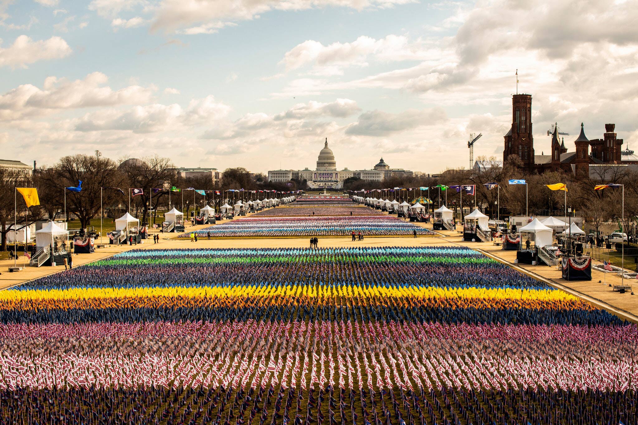 与大多数就职典礼的气氛不同,由于担心发生进一步的暴力事件,近几天的华盛顿特区变成了一个武装营地,2.5万名国民警卫队士兵与数千名警察封锁了市中心的一大片区域。同时,由于疫情仍在肆虐,美国死亡人数已超40万,美国民众被告知减少聚集。这导致了一种离奇的景象:拜登在空旷的国家广场发表讲话,广场上放满了代表人群的旗帜。