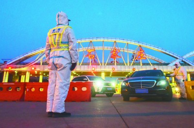 1月6日晚,石家庄市裕华高速口,执勤民警在逐一排查进入市区车辆。赵杰摄/光明图片