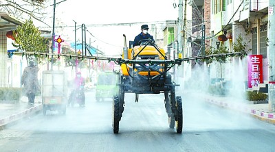 1月15日,工作人员使用农用喷雾机对石家庄市藁城区禅房村进行全面消杀。赵杰摄/光明图片
