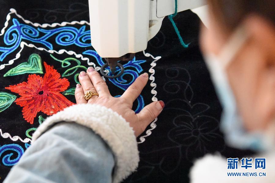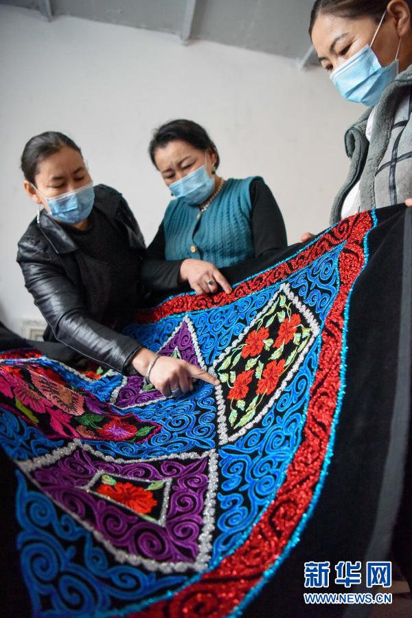 1月23日,在吉木萨尔县白泉村刺绣专业合作社,绣娘检查制作完成的哈萨克族刺绣。