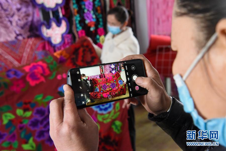 1月23日,在吉木萨尔县白泉村刺绣专业合作社,绣娘为客户拍摄订做的哈萨克族刺绣。
