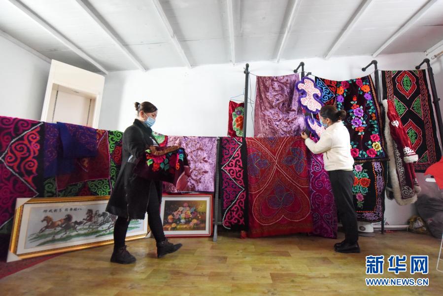 1月23日,在吉木萨尔县白泉村刺绣专业合作社,绣娘在布置产品展示区。