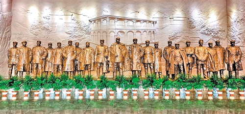 遵义会议陈列馆入口大厅的雕塑,展示的是遵义会议参加者的形象。经济日报-中国经济网记者 吴秉泽摄