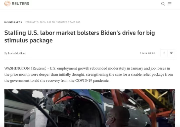 △路透社称,停滞的美国劳动力市场推动拜登政府大规模纾困计划的实施