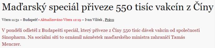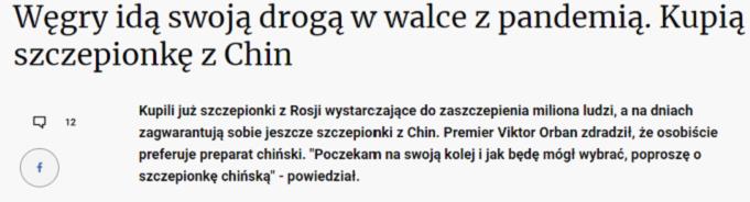 1月29日,波兰门户网站money.pl发表题为《匈牙利在抗击疫情上走自己的道路,将购买中国疫苗》的文章,报道称“匈牙利决定把命运掌握在自己手中”,与中国签订了合同,购买中国的新冠疫苗。