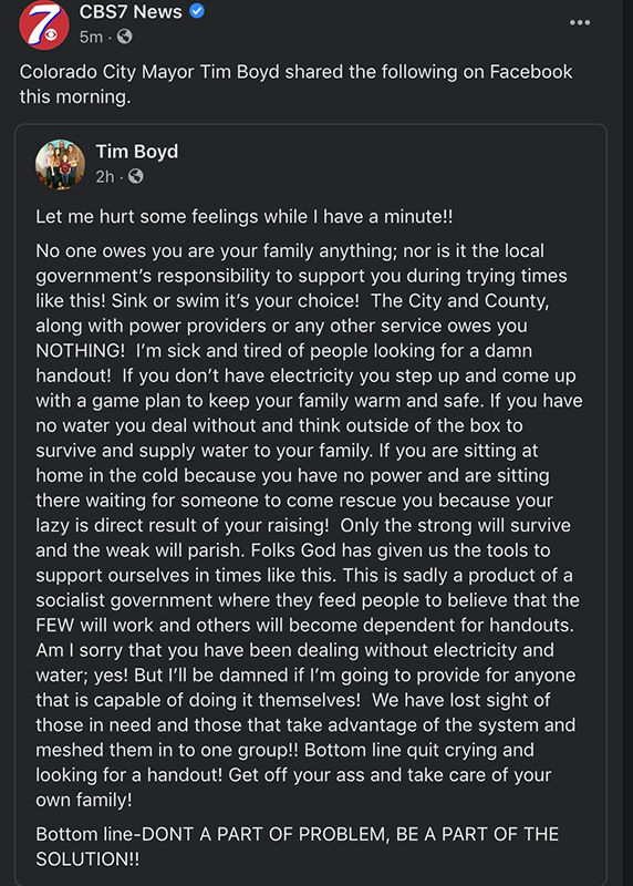 得州小城科罗拉多市的市长博伊德(目前已请辞)日前在社交媒体上发了一段狠话,几乎穿透屏幕,“没人欠你或欠你家什么,地方政府也不欠你的,没责任在这种时候帮你……市里、县里、电力供应商或任何企业都不欠你的!我已经烦透了人们寻求该死的施舍! 如果你没有电,你就想出个办法来,让你的家人温暖和安全……如果你因为没有电而受冻,坐等别人来救你,你的懒惰是你养成的! 适者生存、优胜劣汰……”
