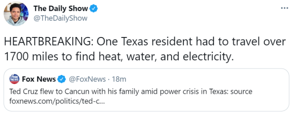 美国多家媒体报出克鲁兹出国的事之后,引来大量愤怒的网民。美国脱口秀主持人特雷弗·诺亚揶揄道:“让人心碎:一位得州居民(克鲁兹)不得不跋涉1700英里去寻找暖气、水和电力供应。”