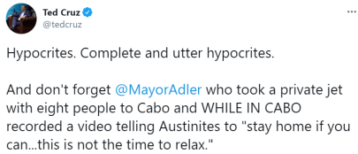 支持者认为,克鲁兹不是行政官员,职责范围也没有救灾一项,属于无能为力。但很多人仍用“虚伪”一词来形容克鲁兹,特别是他抨击政敌的推文被人翻出来之后。克鲁兹去年12月发文,称民主党籍的奥斯汀市市长疫情期间飞到墨西哥的度假胜地卡波圣卢卡斯(Cabo San Lucas),反而要求奥斯汀市民待在家里。“伪君子。完全虚伪的人”,克鲁兹当时写道。