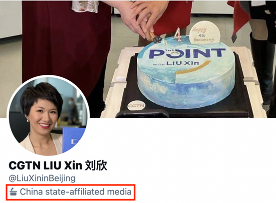 △CGTN主播刘欣的主页被推特加上了“中国官方媒体”的标签。(推特截图)