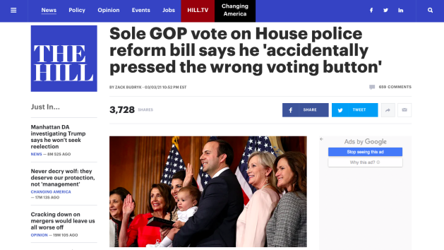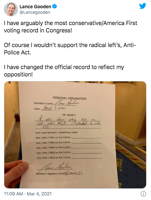 美国《国会山报》注意到,在投票中,唯一一名共和党人—来自得克萨斯州的古登众议员(GOP Rep. Lance Gooden),对议案投出了赞成票。正当有媒体开始赞扬古登的党派协作精神时,古登却在社交媒体上做出澄清,称自己是在投票时一时“手滑”,按错了投票键。古登重申,“我绝不会支持激进的民主党人提出的‘反警察’议案。”