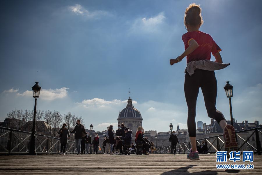 3月20日,一名女士跑过法国巴黎塞纳河上的艺术桥。新华社发(奥雷利安·莫里萨尔摄)