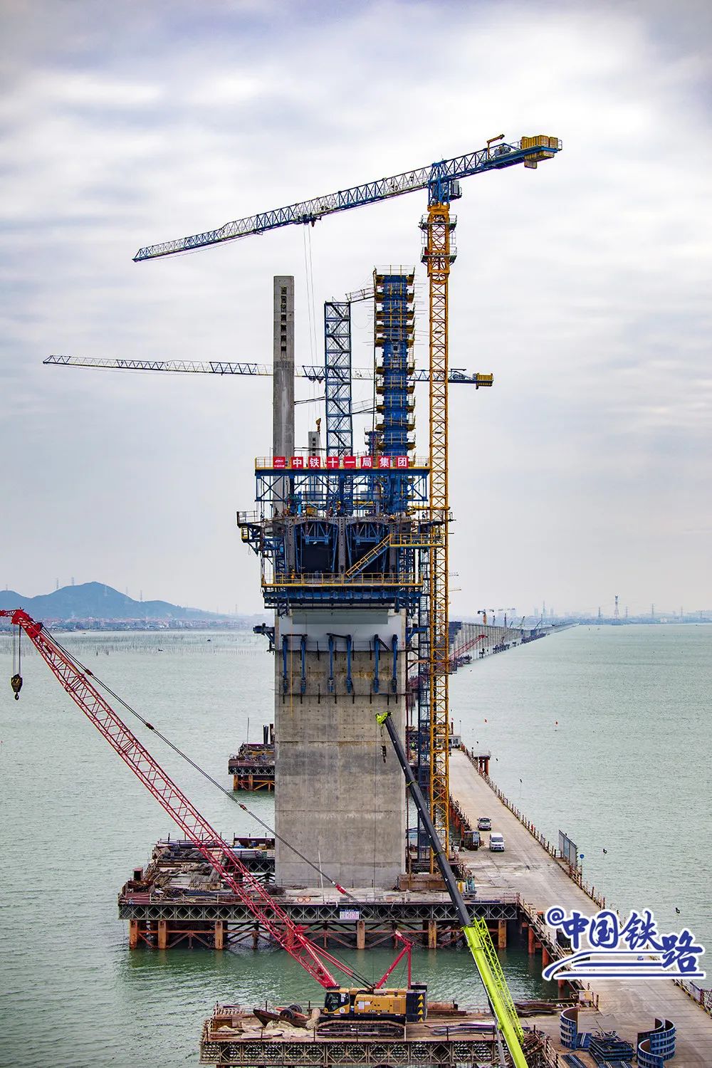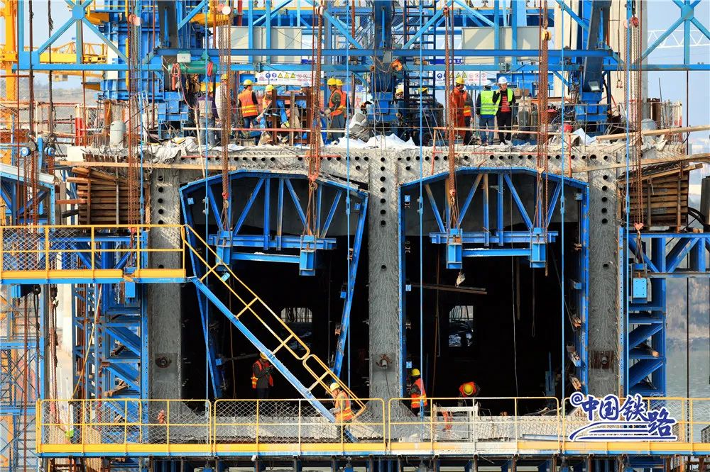 铁路建设者克服大雨、台风等海上恶劣天气影响,采取预埋劲性骨架、增加控制点位等手段实现索鞍精确定位,并建造BIM模型,优化钢筋布置,确保施工顺利进行。