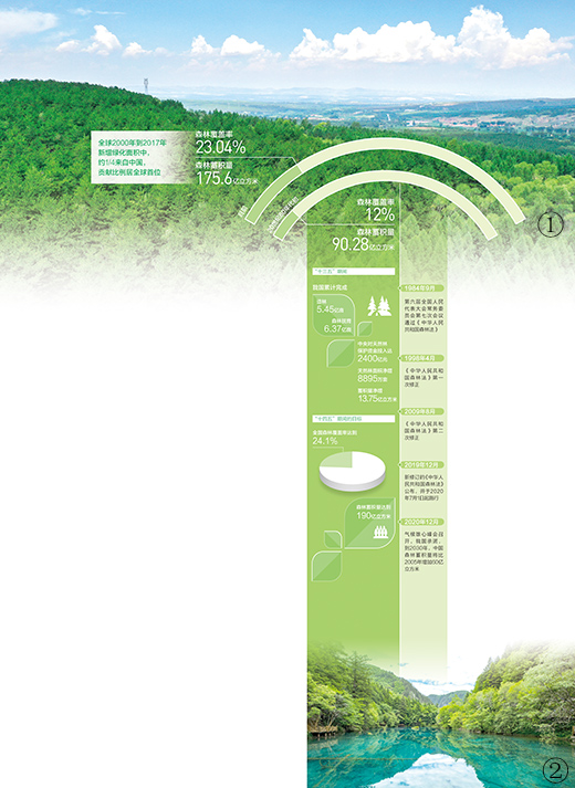 图①:山西省右玉县四五道岭生态园区。新华社记者 曹 阳摄 图②:四川省九寨沟风景名胜区。新华社记者 沈伯韩摄
