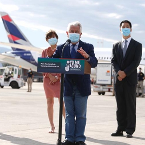 第六批中国科兴公司生产的新冠疫苗21日运抵智利首都圣地亚哥,智利卫生部长帕里斯、中国驻智利大使牛清报赴机场迎接这批疫苗。
