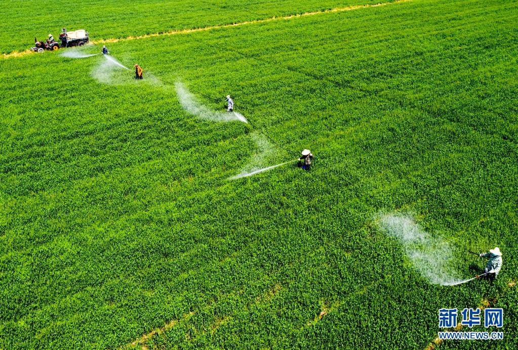4月6日,安徽省合肥市庐江县白湖镇白湖社区,农民在田间进行小麦赤霉病防治作业。