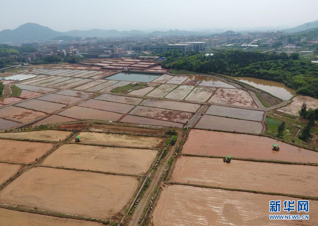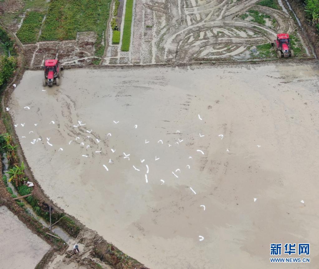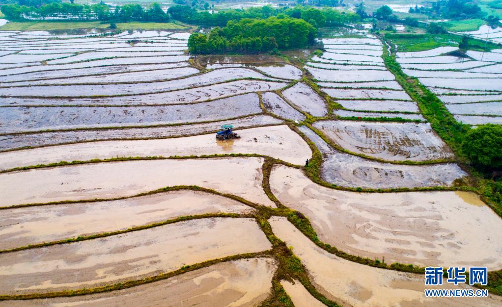 4月6日,江西省新余市仙女湖区钤阳办事处白田村农民驾驶农机耙田、施肥,为早稻插秧作准备(无人机拍摄)。