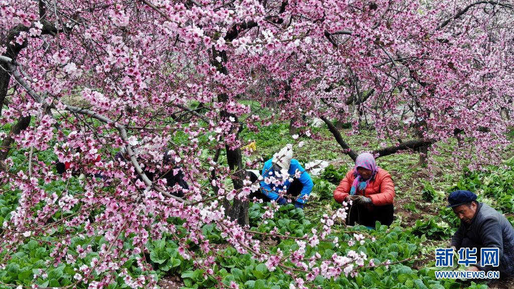 4月6日,甘肃省陇南市宕昌县城关镇玉地河村群众在桃树下采挖小白菜。