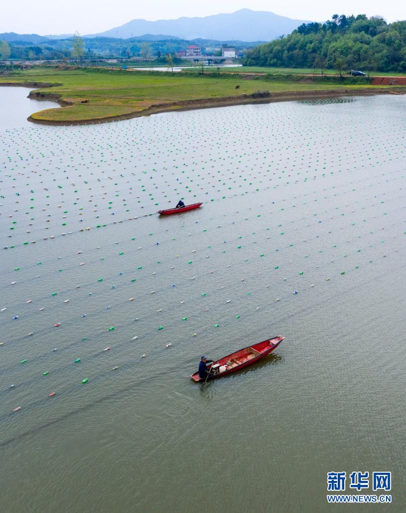 4月6日,在江西省九江市都昌县新妙湖畔珍珠养殖基地,蚌农在投放珍珠蚌(无人机照片)。