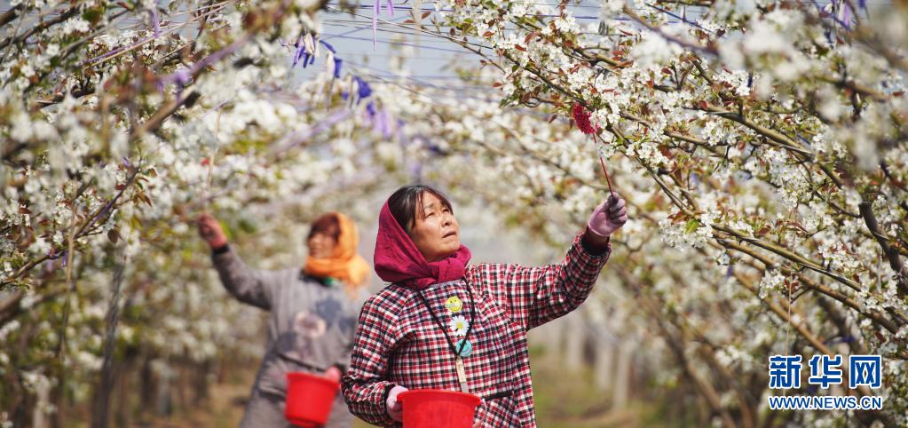 4月6日,山东滨州邹平市长山镇八方农场的果农在给梨花授粉。