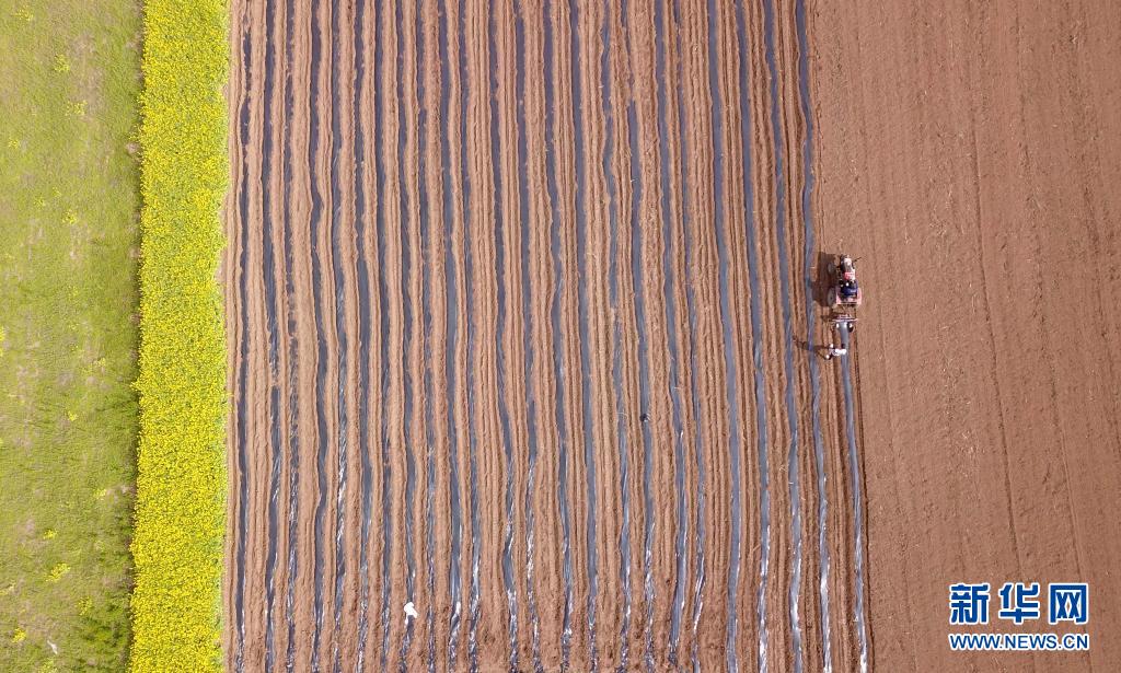 4月6日,在河南省洛阳市汝阳县蔡店乡孟脑村,农民驾驶拖拉机在辣椒地里覆盖地膜,为及时移栽辣椒做好准备工作(无人机照片)。