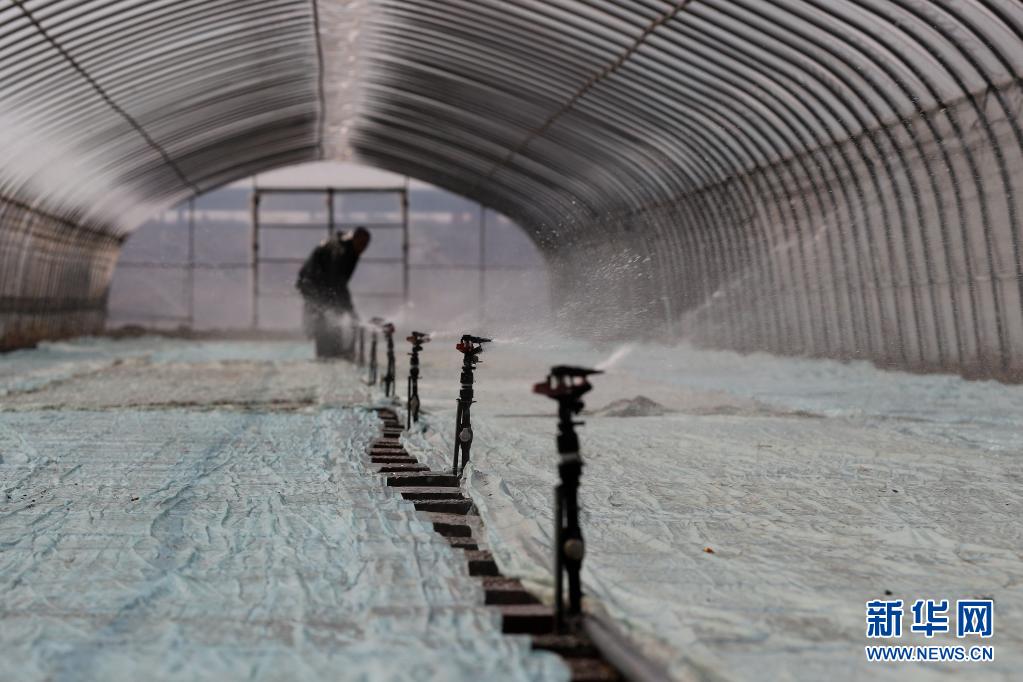 4月6日,河北省唐山市海港经济开发区水稻种植合作社的社员在育秧棚内给秧盘浇水。