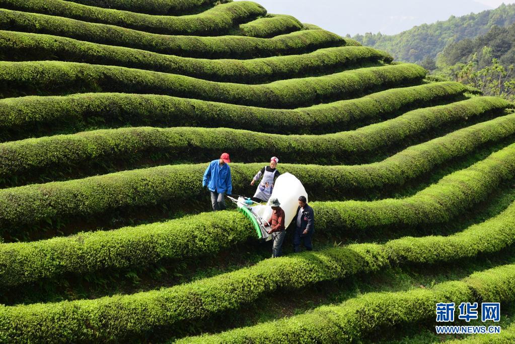 4月6日,浙江杭州建德市的茶农操作采茶机采收春茶青叶。
