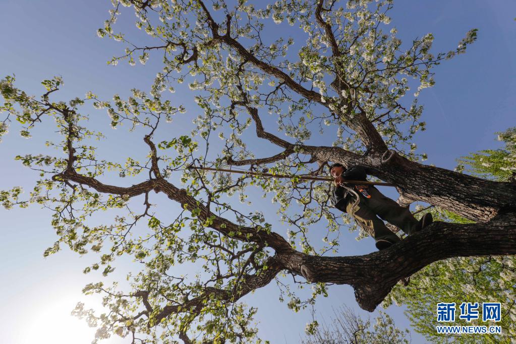4月6日,河北唐山遵化市铁厂镇东平台村的农民在果园管护梨树。