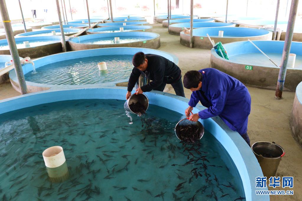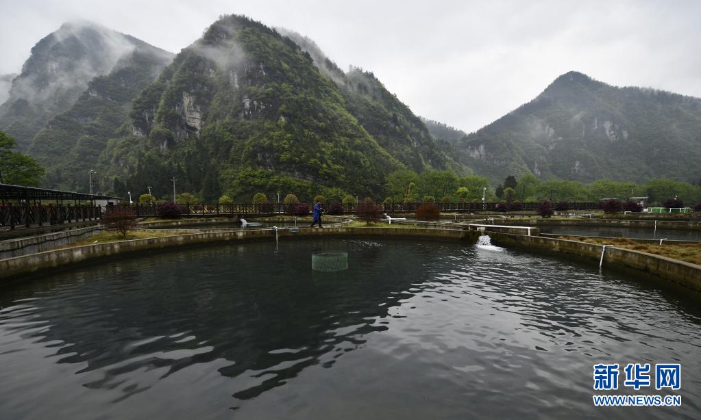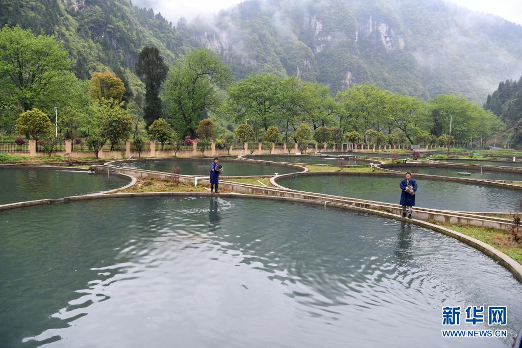 4月10日,工人在贵州省铜仁市江口县德旺乡净河村的鲟鱼养殖基地内放养鱼苗。