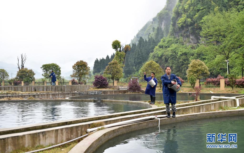 4月10日,工人在贵州省铜仁市江口县德旺乡净河村的鲟鱼养殖基地内撒饲料。