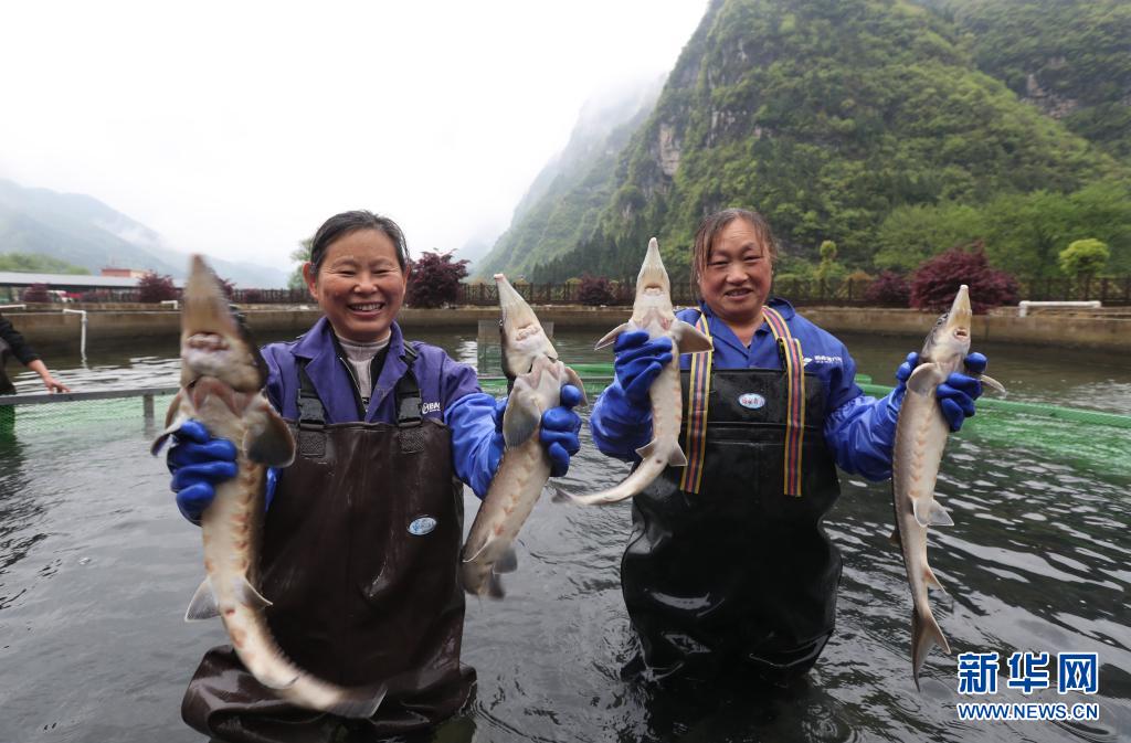 4月10日,在贵州省铜仁市江口县德旺乡净河村的鲟鱼养殖基地内,工人展示成品鱼。