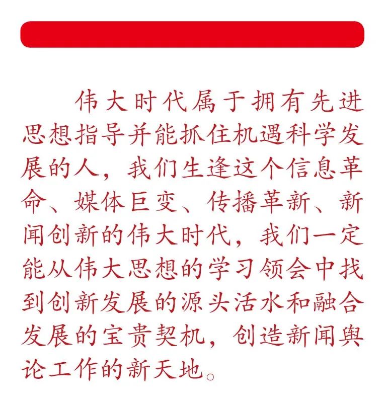 习近平新闻舆论重要论述的原创性理论观点,是对马克思主义新闻理论的丰富发展,是对中国特色社会主义新闻事业规律的认识深化,是新时代全面加强党对新闻舆论工作领导的根本指南。我们深入领会其中蕴含的精髓要义,认真学习贯穿其中的唯物辩证法和历史观,对于把握世界发展大势、认识两个大局、推进“十四五”规划建设、推动建设具有强大凝聚力和引领力的社会主义意识形态、建设具有强大生命力和创造力的社会主义精神文明、建设具有强大感召力和影响力的中华文化软实力,以及讲好中国故事,传播好中国声音,提高国际话语权,形成有利的国际国内环境,有着重要的战略意义和强烈的现实意义。伟大时代属于拥有先进思想指导并能抓住机遇科学发展的人,我们生逢这个信息革命、媒体巨变、传播革新、新闻创新的伟大时代,我们一定能从伟大思想的学习领会中找到创新发展的源头活水和融合发展的宝贵契机,创造新闻舆论工作的新天地。
