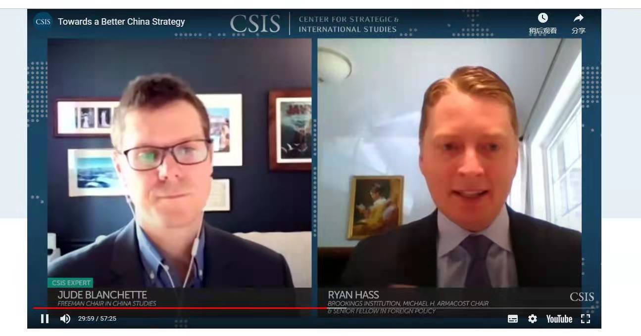 △何瑞恩(右)4月在美国战略与国际问题研究中心的一场视频论坛中建议美国政府制定更好的对华战略