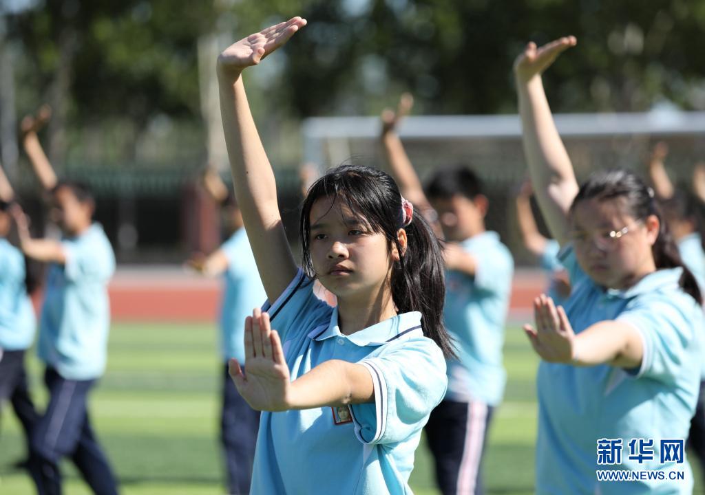 5月28日,河北省河间市第二中学的学生在操场上练习传统武术。