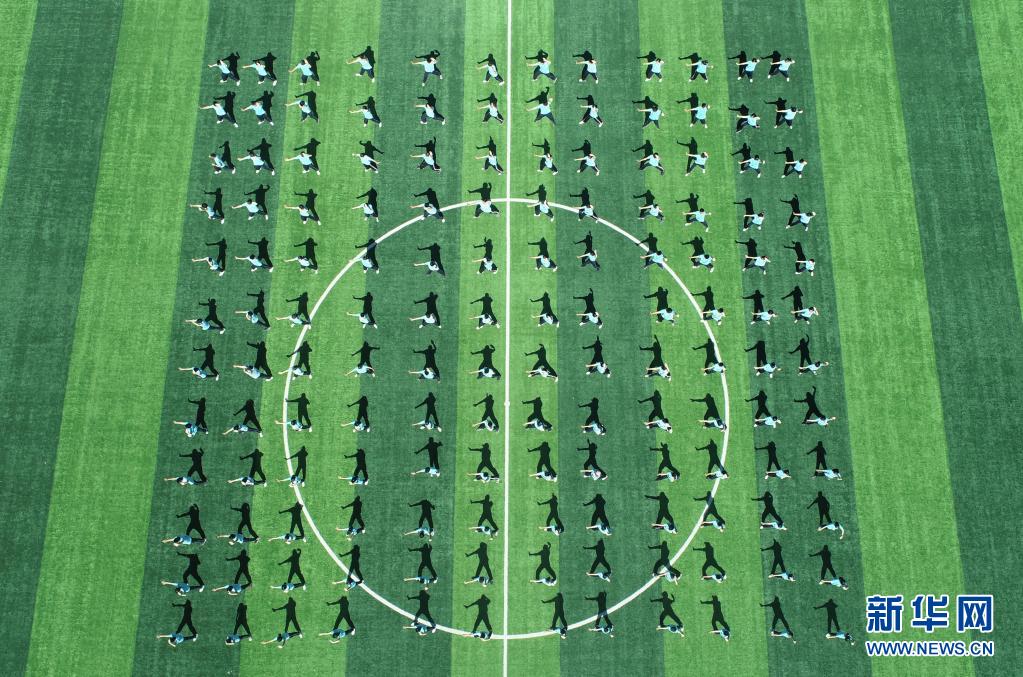 5月28日,河北省河间市第二中学的学生在操场上练习传统武术(无人机照片)。
