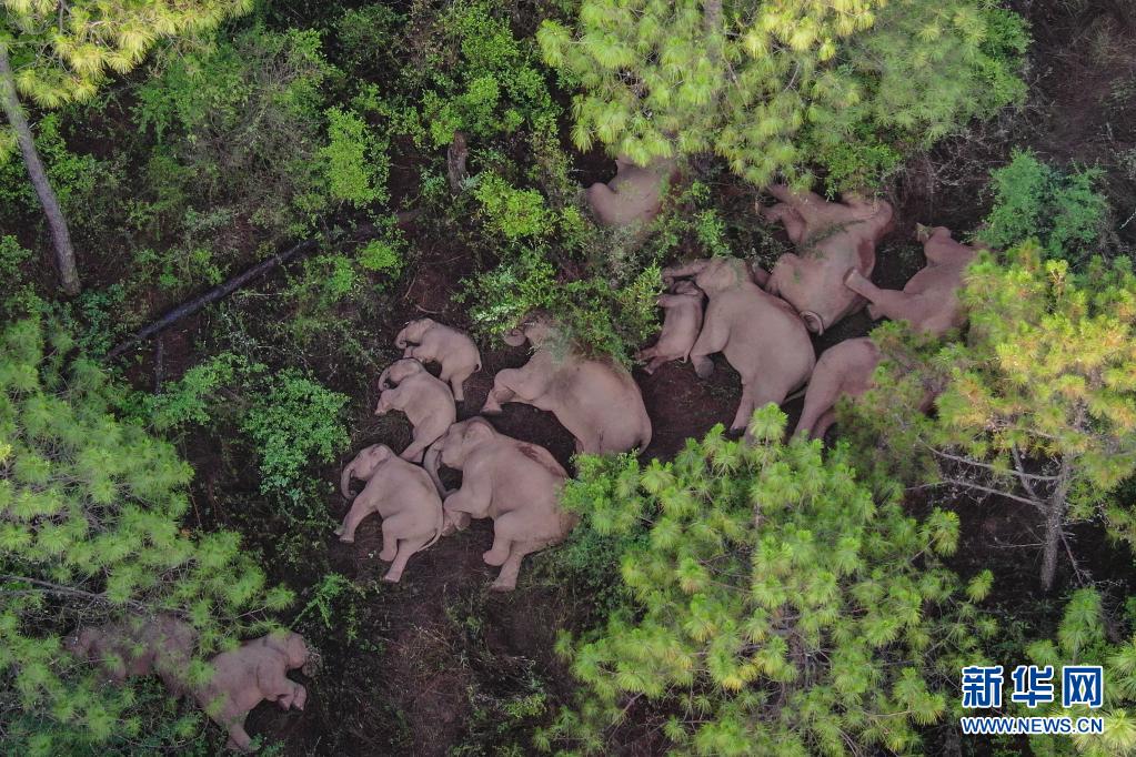 这是6月13日在云南省玉溪市易门县十街乡拍摄的象群(无人机照片)。新华社发