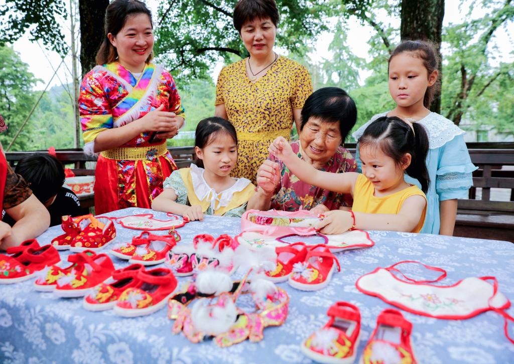 6月13日,在浙江省湖州市长兴县小浦镇方一村,当地的非遗传承人教孩子们制作老虎鞋、老虎帽。新华社记者 徐昱 摄