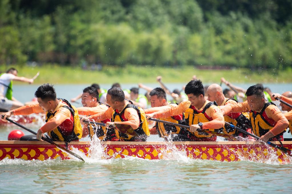 6月13日,在湖南省汨罗市屈子文化园举行的龙舟表演赛上,参赛龙舟队员在奋力比赛。新华社记者 陈思汗 摄