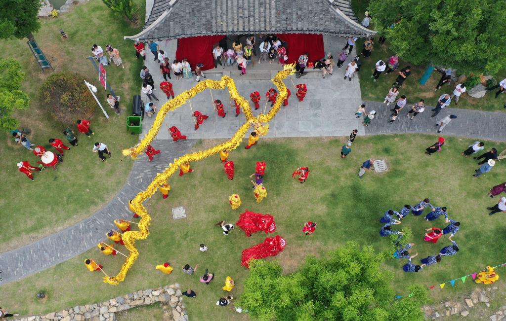 6月13日,在江苏省淮安市盱眙县第一山历史文化街区,民俗演员在舞龙。新华社记者 季春鹏 摄