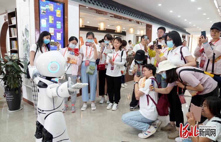 图为采访团在白沙村阅览室和小机器人互动。 郭明明摄