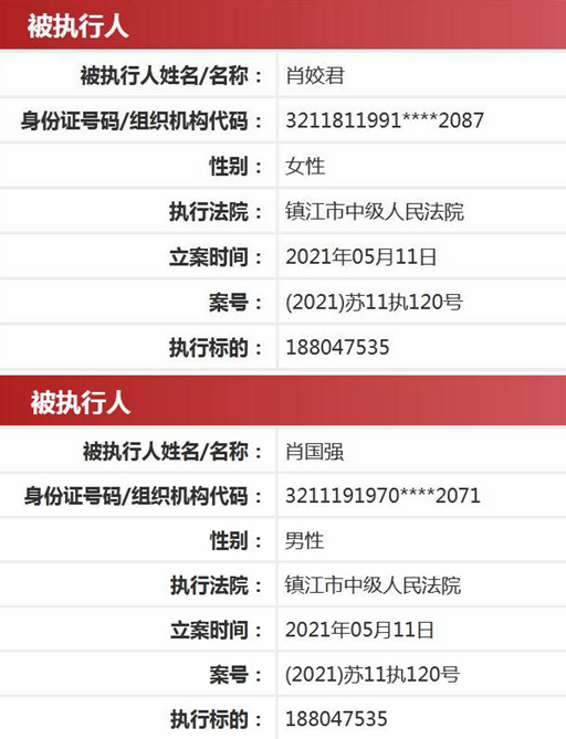 近年来,花王股份业绩不佳,债务缠身,同时实控人股权数次被冻结。中国执行信息公开网显示,肖姣君于5月11日被镇江市中级人民法院列为被执行人,执行标的1.88亿元。同一案号下,其父肖国强也有被执行人信息,金额和立案时间均一致。