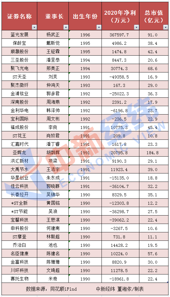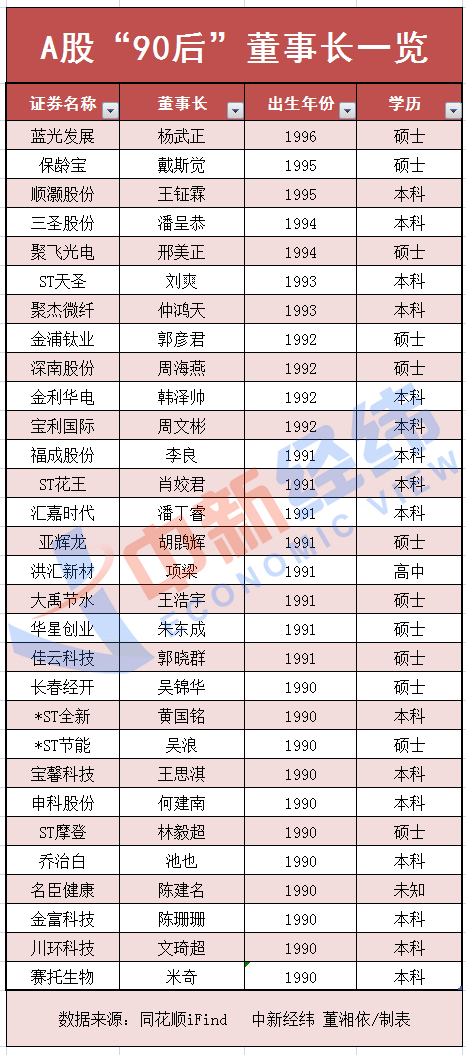 中新经纬客户端查询同花顺iFind数据发现,目前A股市场上有30位上市公司董事长是“90后”,绝大部分是创始人的子女,最小的为1995年出生,最大的为1990年出生。