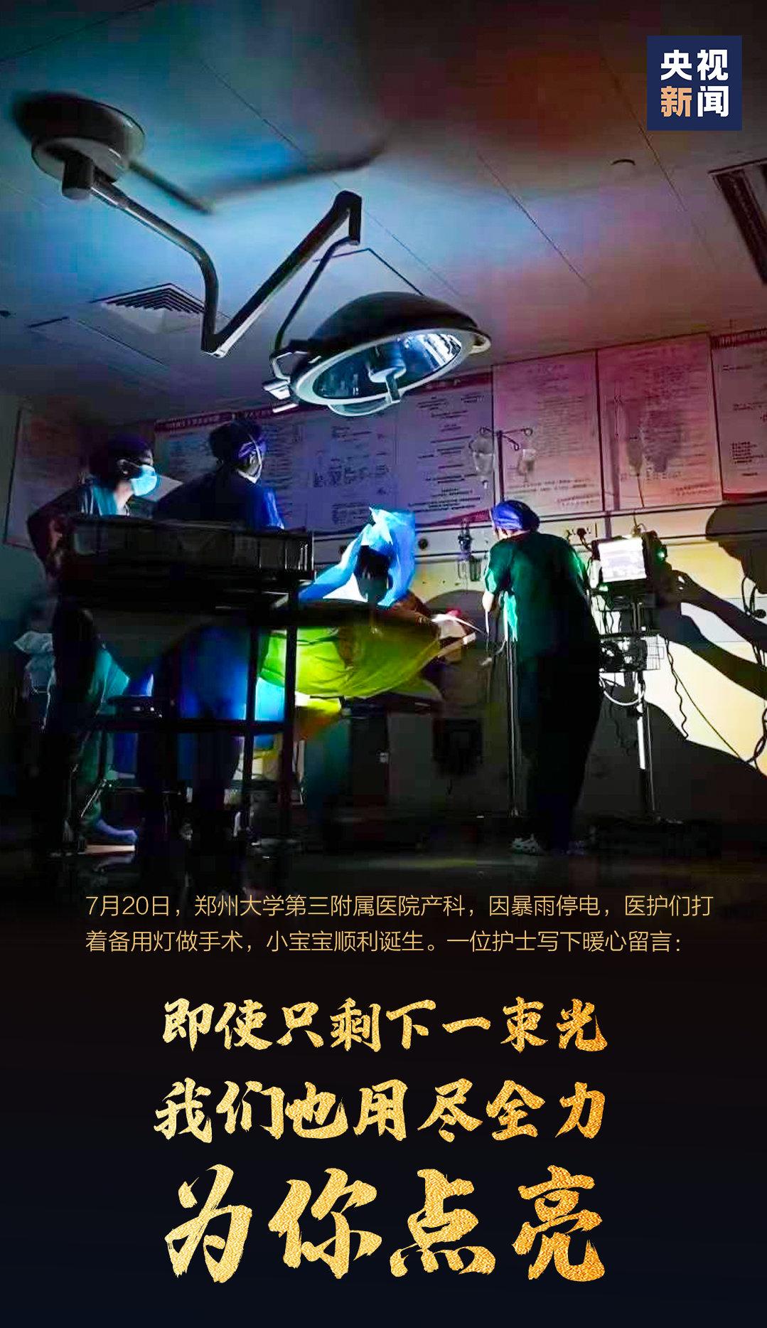 时刻新闻 —分享— 河南省妇幼保健院20日晚因暴雨停电。昏暗的产房中,医护全力守护生命,打着备用灯完成接生。网友:外面洪水凶猛,而你在用爱搭建的地方平安诞生~这束光照亮新生和希望,感恩,祝福! 来源:央视新闻客户端 编辑:马丽红