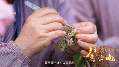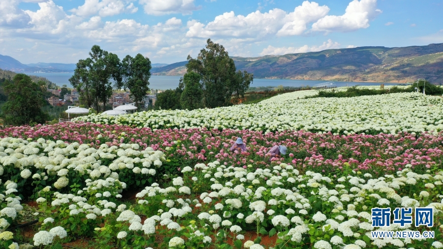 航拍镜头下工人在采绣球花花粉。新华网 赵普凡 摄