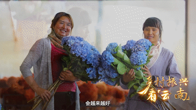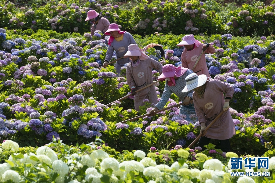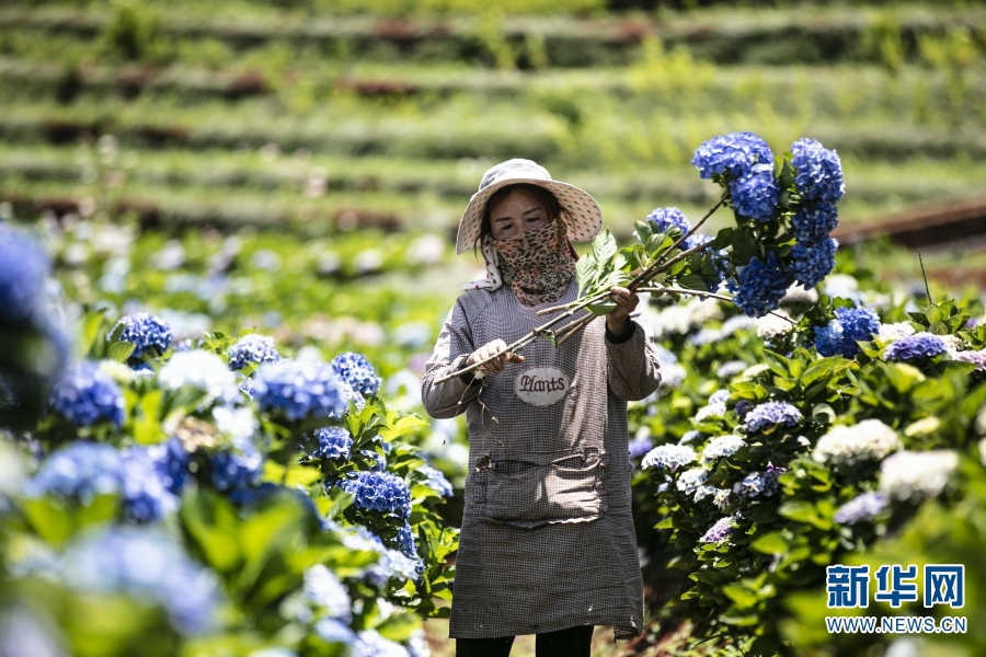 王丽稳在采摘绣球花。新华网 丁凝 摄