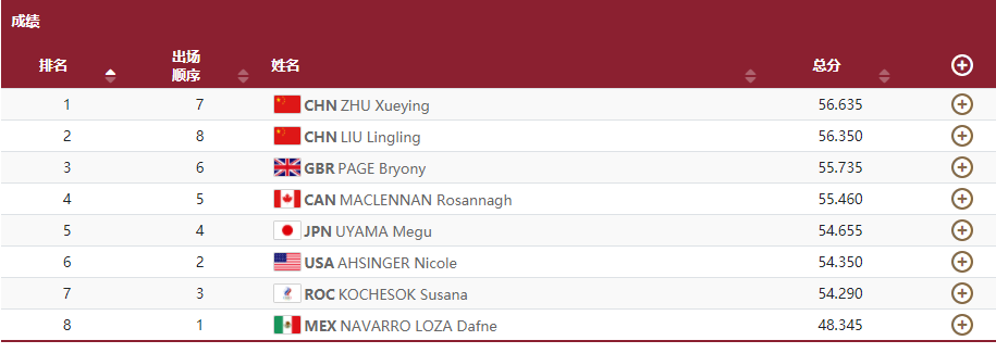 中国选手朱雪莹倒数第二个登场,起跳后,她节奏控制得很好,腾空高度也不错,位移控制到位,整套动作完成相当出色,发挥出了平常的训练水平,最终以56.635分超越佩奇排名第一,这也意味着中国队已经拿到了这枚金牌。