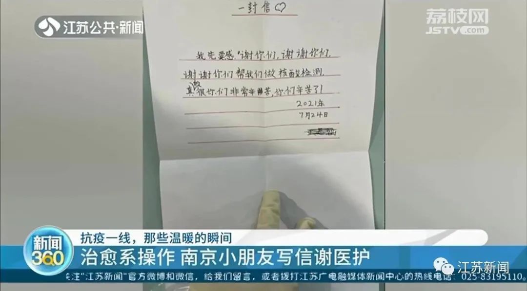 类似的暖心事件不断上演。7月25日凌晨1点左右,南京同仁医院医护在支援江宁开发区小学核酸检测时,一位小朋友突然跑过来,将一封信塞进医护人员手中。